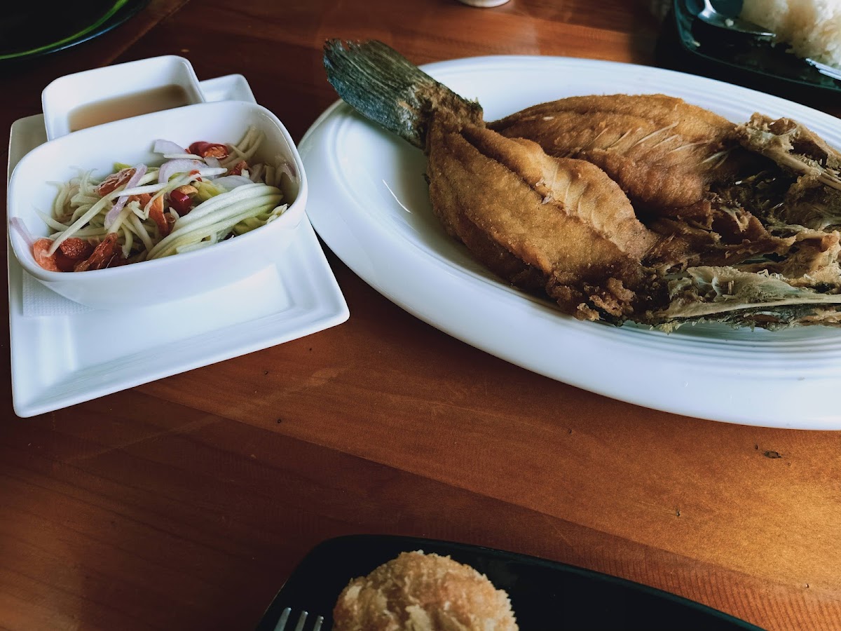 This restaurant is a hidden gem! The seafood I had was fresh and full of flavour. This place is located by the river in a quiet setting with a view of the bridge on the river. Staff are friendly and willing to help. The atmosphere is relaxed and you get to experience the authentic Thai cuisine and culture with the many locals who frequent this place. Service was quick and there is parking available. I highly recommend this place.