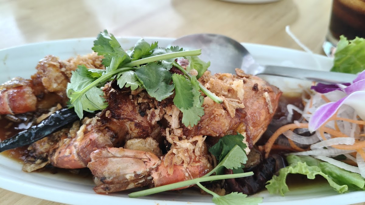 Nice restaurant on the west bank of the Chao Phraya River just north of Bangkok with 2-tier riverside covered outdoor seating on wood decks and an air-conditioned dining room serving thai seafood. Dishes were tasty. Huge river prawns were fresh and cooked perfectly. Ordered two 400g grilled fresh river prawns coat 1,500฿. They do not have fresh mud crabs but offer fresh blue crabs and soft shell crabs. Came at lunch time it was not crowded and though hot midday there are fans and a southerly breeze from the river. Looking to come back for evening dinner.