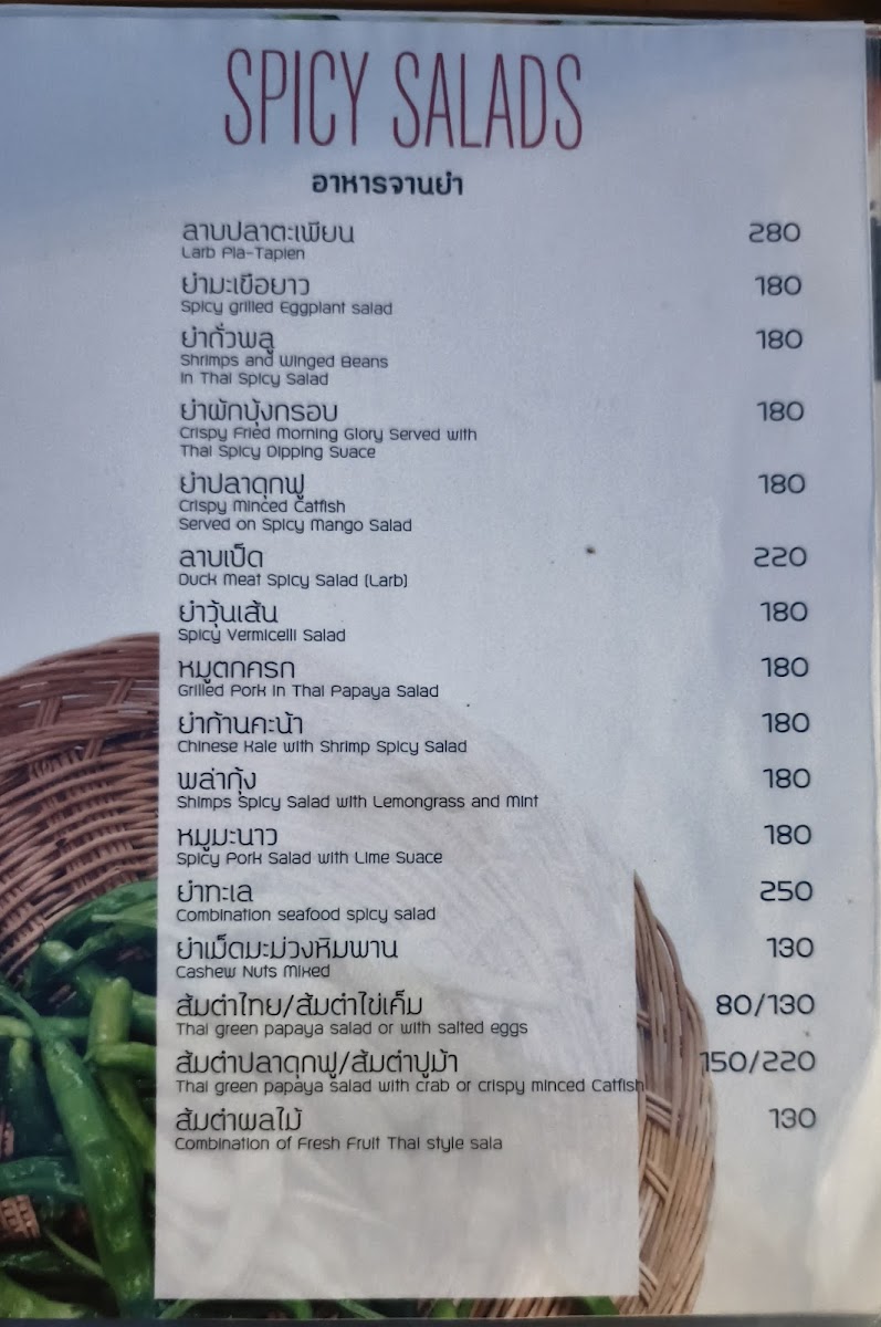 Typical highlights include grilled giant river prawns and fried prawns with tamarind sauce, served alongside satisfying staples like Baan Dock Chan fried rice and a variety of spicy salads such as Larb Pla-tapien. The menu also features rich, flavorful options like Thai-style deep-fried marinated beef and crab meat with yellow chillies served with a classic Esan dipping sauce.